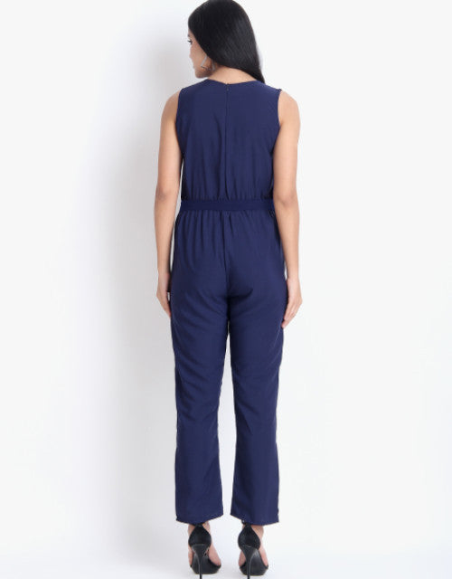 Women Casual Solid Blue Sleeveless Full Length Crepe Jumpsuit