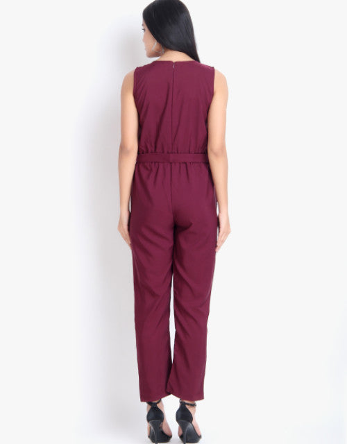 Women Casual Solid Maroon Sleeveless Full Length Crepe Jumpsuit