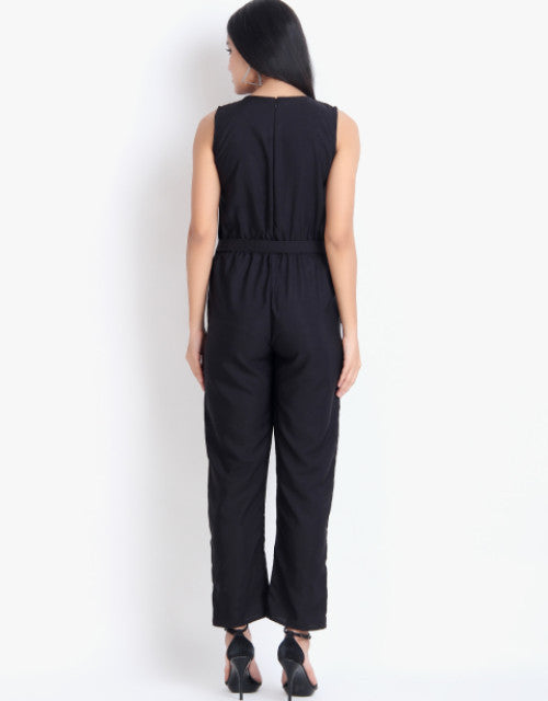 Women Casual Solid Black Sleeveless Full Length Crepe Jumpsuit